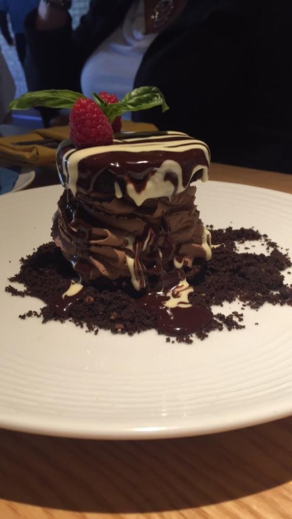 We all tried a spoonful but we were too distracted by the chocolate….whoa! If you don’t ever decided to eat a meal here-please, please go and enjoy this amazing dessert. It is rich in flavor, not too overly sweet, amazing chocolate and almond flavor in the cake and the Bailey’s zabaglione frosting/drizzle on top made it complete. This ‘dolci’ (pictured below after the dinner review) is absolutely worth the price and the calories!